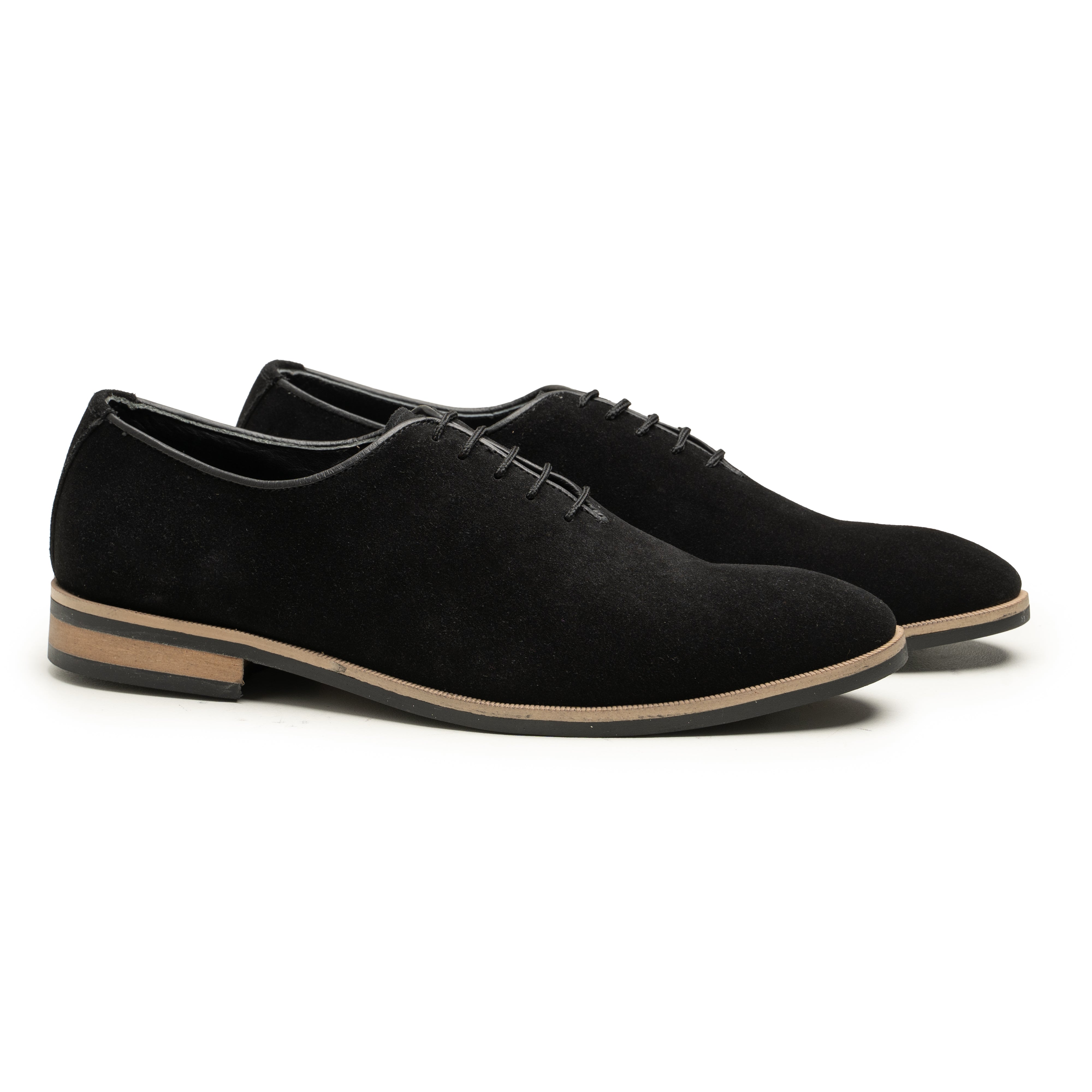 Pair of black suede dress shoes, featuring a sleek and minimalistic design with a lace-up closure, whereas soles have a light brown trim