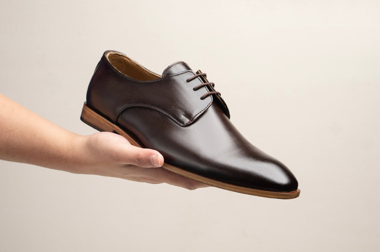 A plain fronted, three eyelet derby shoes made up of finest cow leather and tanned buffalo leather sole, ensuring high level of comfort and durability. Padded footbed provides extra comfort for long hours wearing.